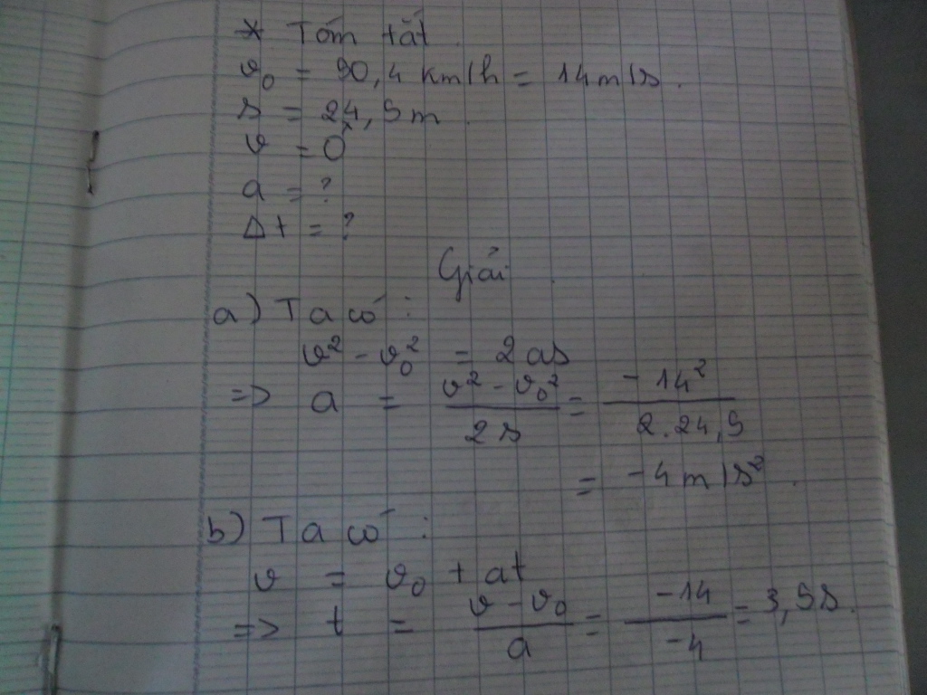 Một xe máy đang đi với v=50,4 km/h bỗng người lái xe thấy có ổ gà trước mắt cách xe 24,5 m.Người ấy phanh gấp và xe đến ổ gà thì dừng lại.a/Tính gia tốc b/Tính thời gian giảm phanh.