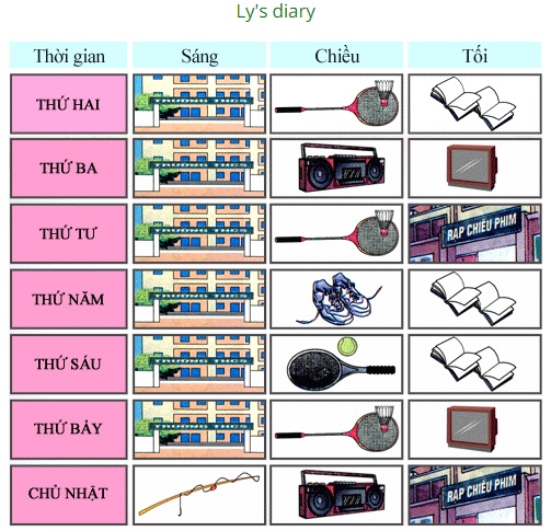 - Now practice with a partner. Ask and answer questions about Ly's activities. (Bây giờ luyện tập với bạn học. Hỏi và trả lời các câu hỏi về hoạt động của Ly.)