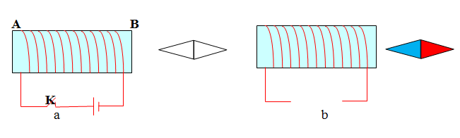a) Cực nào của kim nam châm trong hình a hướng về phía đầu B của cuộn dây dẫn điện