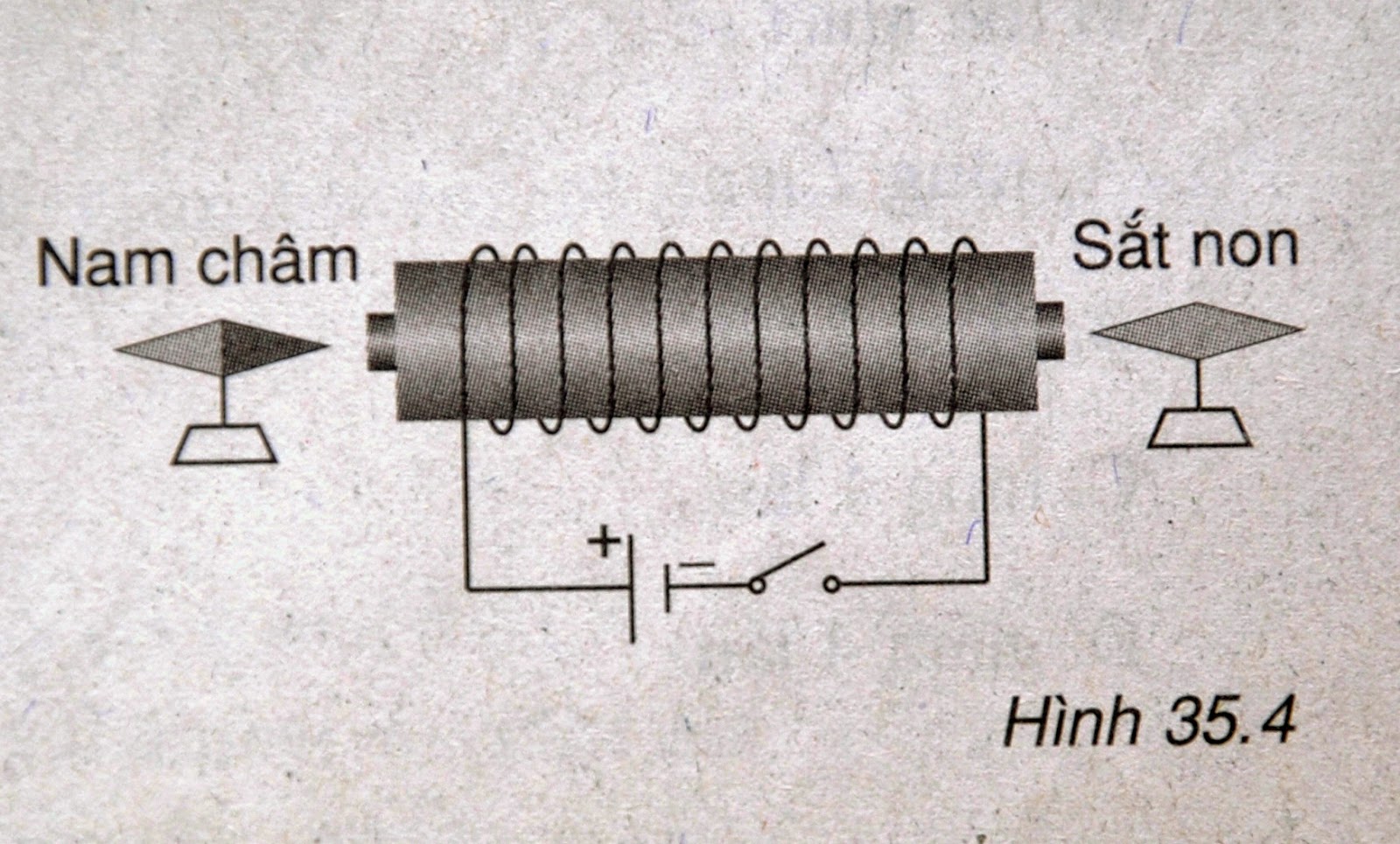 Trong thí nghiệm ở hình 35.4, khi đổi chiều dòng điện chạy vào cuộn dây dẫn thì tác dụng từ của cuộn dây đối với kim nam châm và kim sắt non có gì khác không? Vì sao?